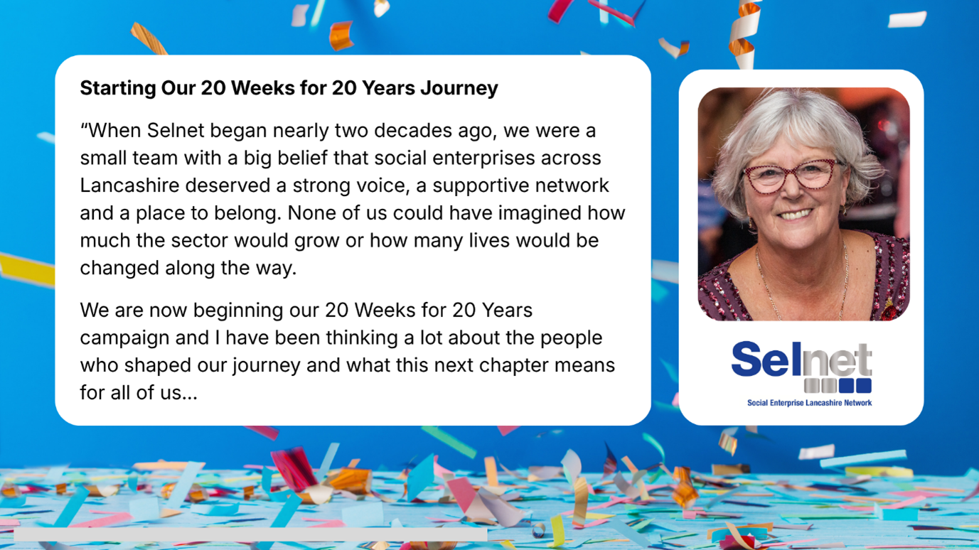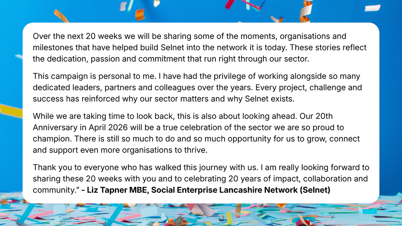 “When Selnet began nearly two decades ago, we were a small team with a big belief that social enterprises across Lancashire deserved a strong voice, a supportive network and a place to belong.