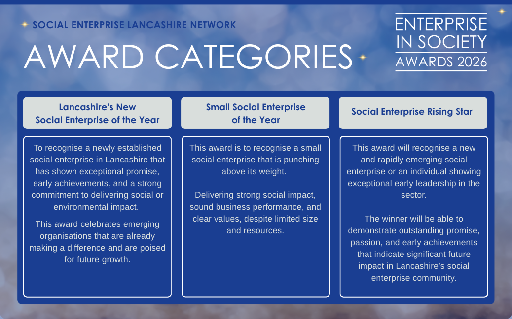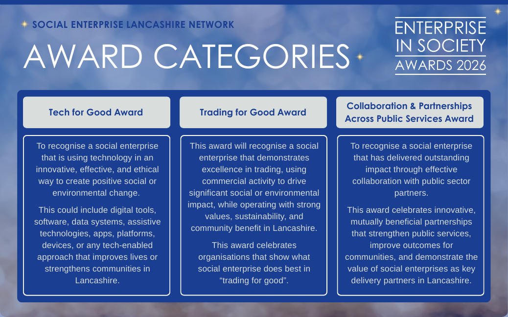 To recognise a social enterprise that has achieved exceptional impact through effective collaboration with public sector partners. It celebrates innovative, mutually beneficial partnerships that enhance public services, improve community outcomes, and highlight the vital role of social enterprises as key delivery partners in Lancashire.