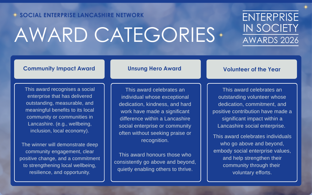 This award shines a spotlight on individuals whose tireless dedication, kindness, and hard work have made a remarkable difference in Lancashire’s social enterprise community. It honours those who, without seeking recognition, consistently go above and beyond to help others thrive.
