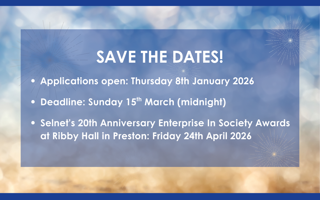 Save the date to join us on Friday 24th April 2026 at Ribby Hall in Preston as we celebrate 20 years of Selnet and the incredible difference social enterprises have made – and continue to make – in Lancashire. Bookings to attend will be open soon – watch this space, and join us across social media for our ’20 Weeks for 20 Years” campaign updates!